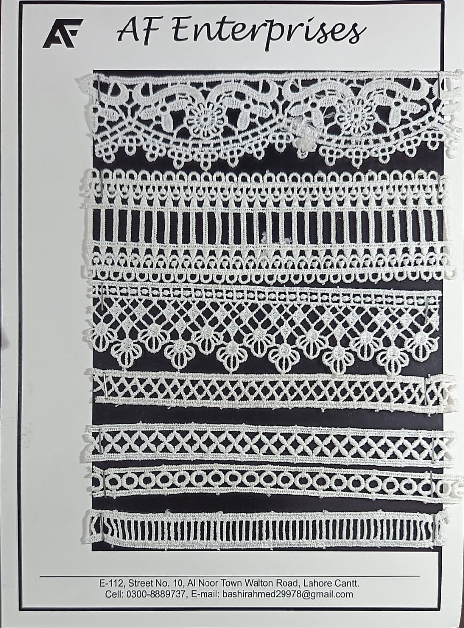 Manufactured using high-quality white embroidery thread, these lace trims offer durability, flexibility, and consistent stitch quality. The designs include floral vine embroidery, ladder-style openwork, looped borders, diamond lattices, cross-pattern geometry, circular eyelets, and linear cutwork trims. Their structured layouts make them especially suitable for neat edging and uniform finishing.