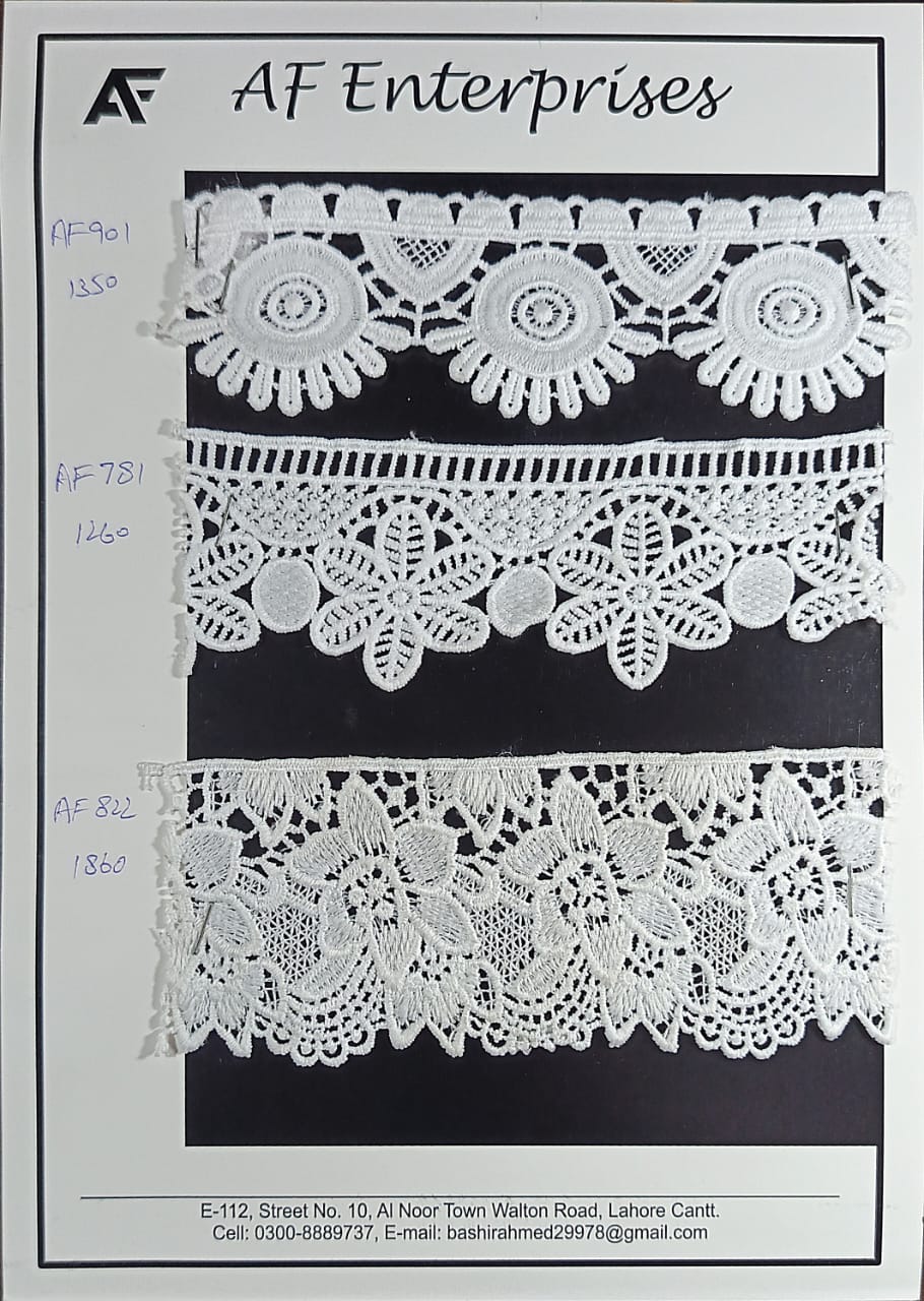 | AF 781 | A refined floral lace with layered flower motifs and fine net embroidery, perfect for elegant garments and premium trims. |