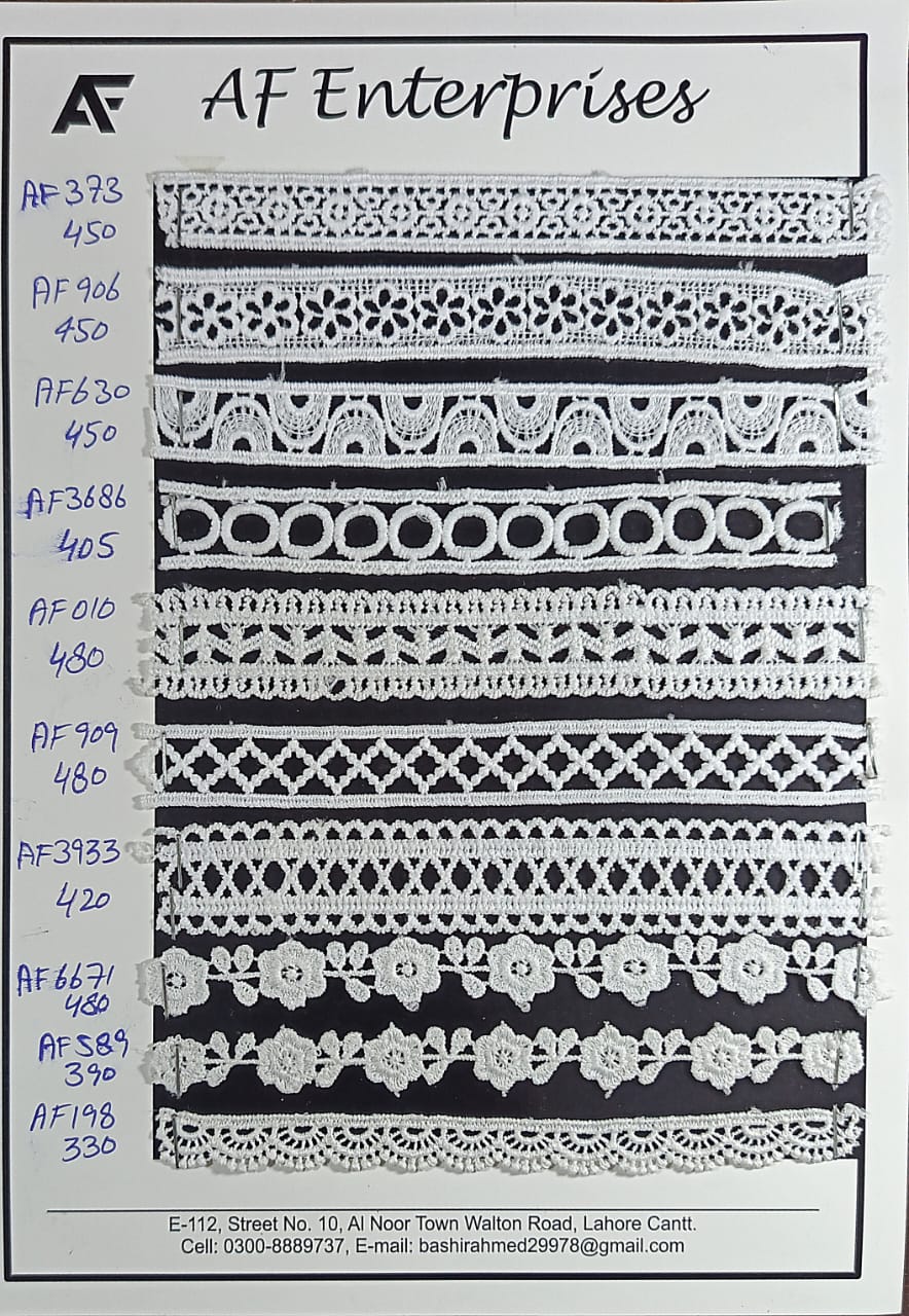Enhance fine detailing with White Embroidered Narrow Lace Trims by AF Enterprises. This versatile collection features floral chains, geometric lattices, circular eyelets, scalloped borders, and delicate cutwork designs crafted in premium white embroidery. Ideal for garments, accessories, and home décor.