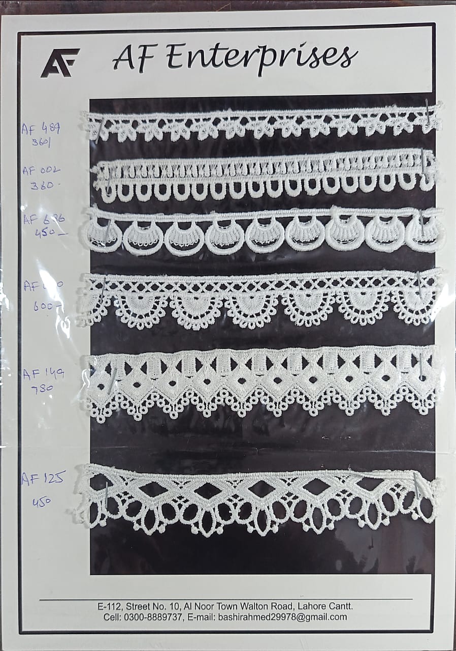 The White Embroidered Narrow & Medium Lace Trims – Decorative Border Collection by AF Enterprises is a versatile assortment designed for refined and elegant textile finishing. This collection includes six distinct lace trims, each offering unique embroidery styles suitable for both subtle accents and decorative borders.
